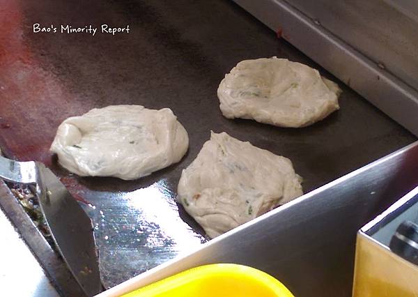 首先把加蔥的麵團放入稍微煎一下,然後用機器壓扁(沒拍到),接著看到就是酥脆的金黃餅皮了!