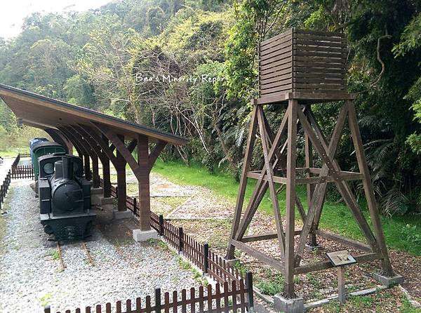 土場派出所旁有一棟木造建築物,是依據昔日土場火車站的舊貌重建的車站,不過我們沒有停下來看。舊車站斜對面的馬路旁則有重建的車站月台, 陳設以前運木材的五分仔小火車及蒸汽火車頭,還有加水用的加水站(雖然我想像不出來要怎麼加水....像吃火鍋加湯那樣嗎?)