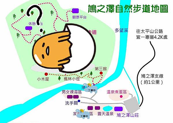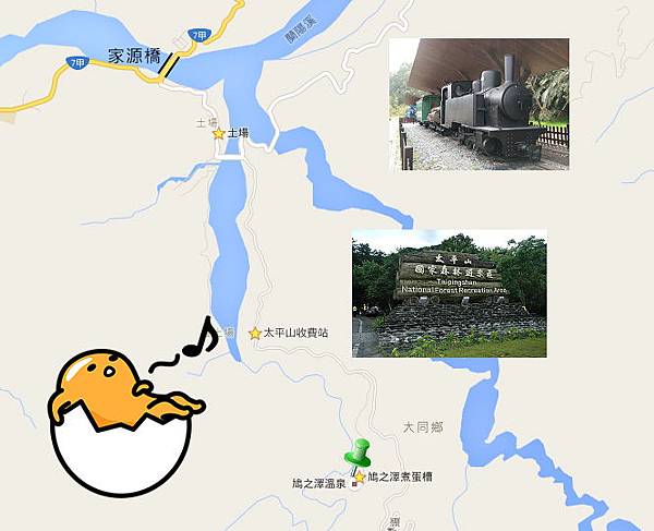 本來已經接近放棄,隨意上網搜尋『宜蘭+地熱+溫泉蛋』,結果百分之九十五的結果是清水地熱,就這麼被我瞄到一篇鳩之澤溫泉!鳩之澤?聽都沒聽過欸!在哪?太平山?看看Google Map好像沒有太遠(相對於其他不知所在之處的地熱而言 XD)、趁現在天色還早,不如就開開看吧!