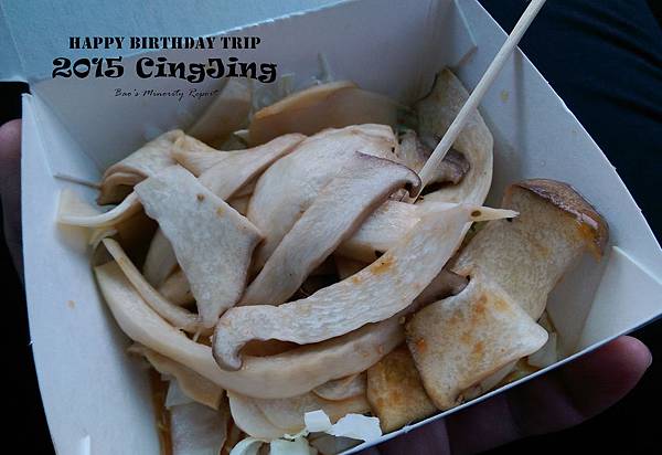 怕回程堵車,整個逛完一圈就準備打道回府。時值正午時分,南票口旁的小吃攤氣氛正熱,不過看來看去也沒特別有興趣的,最後買了一份烤杏鮑菇解饞(完全被唬弄了...店家擺的都是超大支的杏鮑菇,害我以為一份就是整支賣,最後到手的應該只有三分之一吧),結束這一趟有點虛但還是心滿意足的清境之旅。