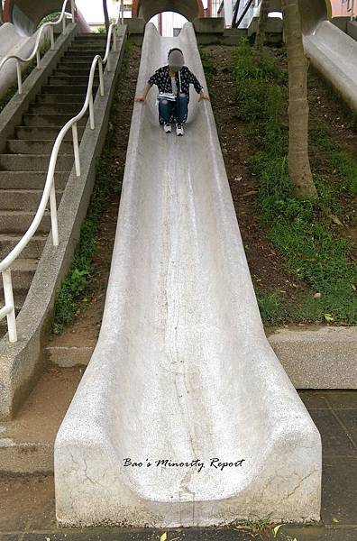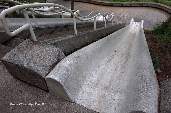 饒富童年回憶的磨石溜滑梯,一次竟然有四座!高度也夠,除了小孩子,大人應該也可以玩得不亦樂乎。難得不必跟小鬼頭們搶道,無奈剛下過雨啊~滑道不但濕濡也堆積了不少落葉,擔心屁股髒也怕滑不動,只好換個方式玩: