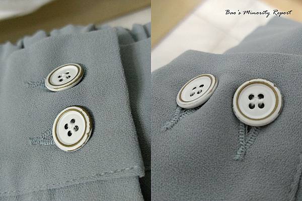 估的~官網商品敘述隻字未提,細節照的示範是黑色款,隱隱約約好像有點顏色不均勻的感覺,的確可能是仿舊、但說是反光也不為過。另外這件寬褲的風格,完全不是走復古路線啊!莫名採用仿舊脫漆的釦子,我實在不懂為何這樣設計...