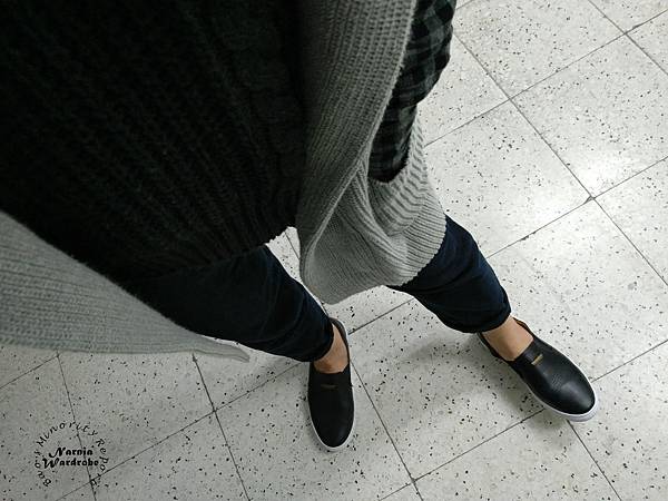 褲子也是小安帶的韓貨:深藍底色,上面有淺淺的格線,記得當年也是滿熱門的單品。務必往上捲兩折,露出腳踝最顯瘦!尤其是矮個子硬是要穿長版大衣,這樣子才能夠抓回比例啊。