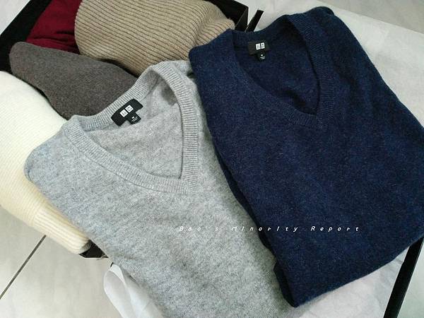 看了一些書籍介紹與IG達人分享後,重新再接觸所謂的平價品牌,繞了一大圈後來看,還真會有挖到寶的時候。最大的優點就是看得到摸得到穿得到,買回家真有問題還能在鑑賞期之內處理。所以擺在最後要分享的這兩件戰利品,Uniqlo男版v領cashmere毛衣,灰色與藍色 (是的~我又破戒包色惹)──