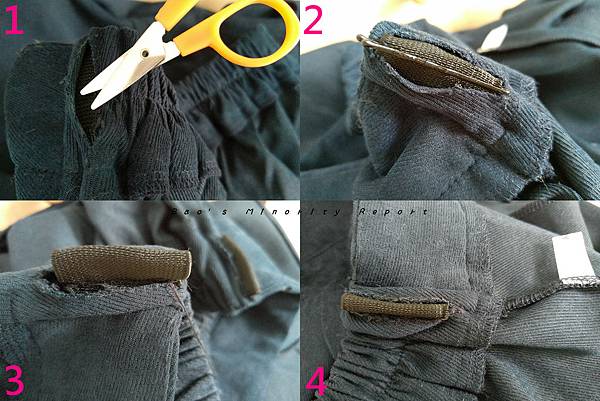 / 找到兩側鬆緊帶固定的縫線處,拆線剪個小洞