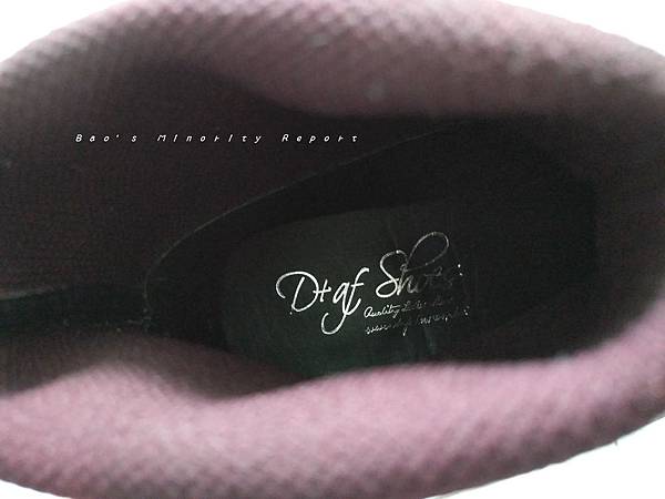 D+AF原本的鞋墊是有一點厚度的,足弓處沒有加厚。也許稱不上非常舒適,但相較於一般硬梆梆的鞋底算是挺不錯的!這部分官網並沒有詳細介紹,不過在一堆外表看起來差不多的流行女鞋品牌中做抉擇,這也算是一項優勢吧。