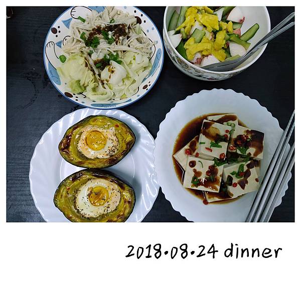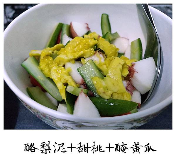 為了裝蛋把酪梨中央的空間刨大些,因為酪梨太小顆挖不了甚麼下來!導致這一盆沙拉的主角是甜桃+醃黃瓜,說實在滋味很微妙哈哈,酪梨泥變成純裝飾 (效果是不錯)