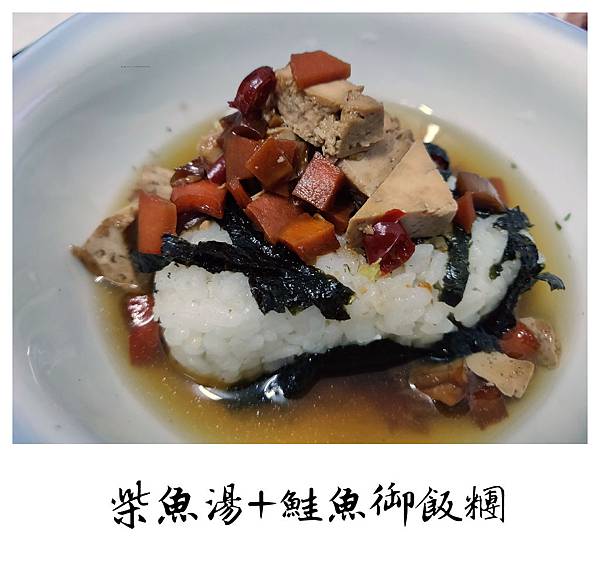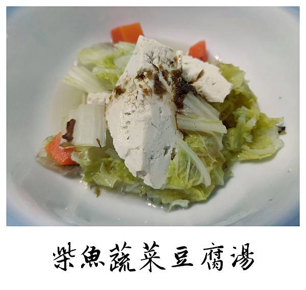撈起食之無味棄之可惜的柴魚片,覺得清清淡淡的高湯看起來有點寂寞。忍不住加東加西,搖身一變成為:柴魚蔬菜豆腐湯-- 還好湯頭甘甜不膩, 單吃可,泡飯也剛剛好。