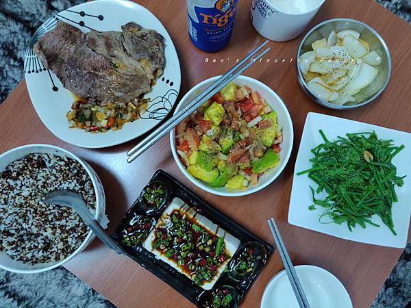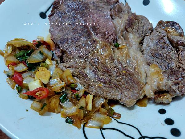累積數次經驗之後,配酪梨吃的洋蔥再也不敢多加,這次用不到半顆!剩下的就切末跟辣椒、青蔥、醬油調成牛排的佐料。至於另外半顆就煎來吃囉!