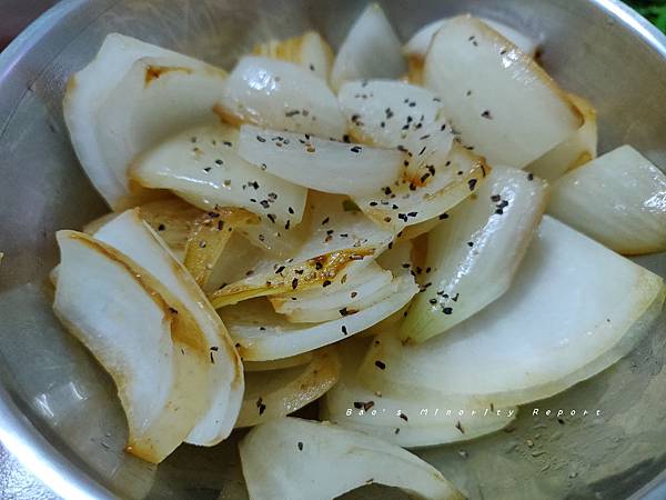 煎牛排的時候順便把洋蔥丟在一旁,除了省油,還可以吸收牛肉精華喔。起鍋後撒點黑胡椒粒,香氣美味更升級👍👍👍