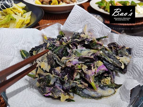 反正也來不及,麵包屑早就被我順手清掉了。但是想嘗試炸紅鳳菜的念頭一成形就很難立即抹去,既然還有雞蛋也有低筋麵粉,不如就來瞎搞一番。