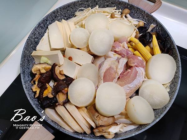 從全聯火鍋祭貨架中挑了馬辣的花雕雞湯底,在大鍋中鋪好喜歡的食材,接著關蓋悶煮。