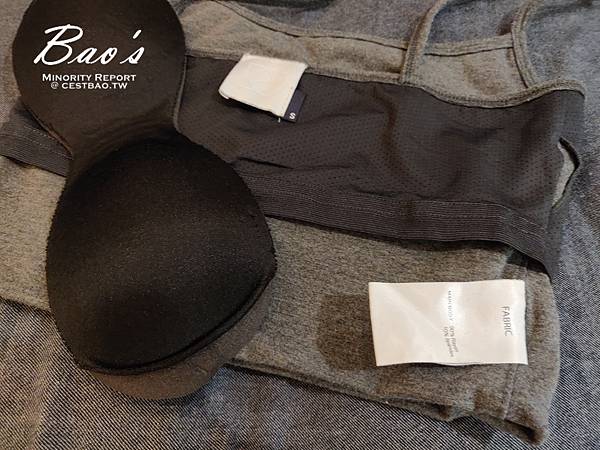 因為短版bratop的狀況才回頭檢視這款背心的胸墊,發現深色款搭配的黑色胸墊一樣有表布翹起的問題,而淺色款搭配的白胸墊倒是沒有。或許是這批胸墊的品管不佳,但在蝦皮上看到激似款的售價非常低廉,可能本來就不是質量多好的東西,讓商品帶了金玉其外敗絮其中的遺憾。