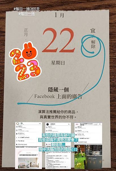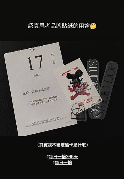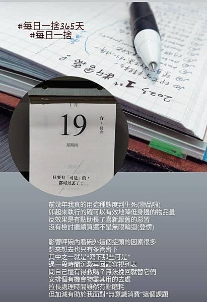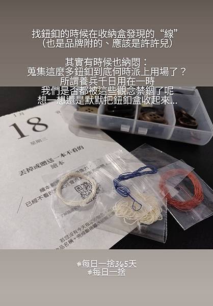 寫下那些帶著許多「可是」的物品們,尋思發揮殘值的可能,譬如:修改不合身的閒置衣服、把鬆弛破洞的襪子用作抹布。而不再適合的衣物、生活用品,則透過適當的管道讓渡給下一位有緣人。