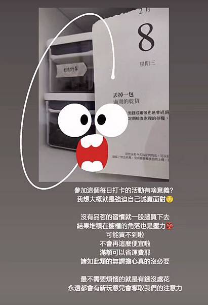 好在任何替代物品都算達標,目前為止都有每天打卡成功。除了丟東西,順便建立反思的習慣也是滿好的,這種時候就特別想念沒有垃圾的公寓生活,希望閉關能有結束的一天,可以再次看到這對可愛小夫妻的分享。