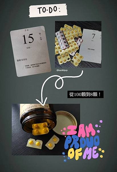 譬如二月清出了一堆看了就吃不完的合利他命,終於在本週成功消滅第一百顆,也讓我明白:盡力維持均衡飲食比起吃滿營養品更適合自己;