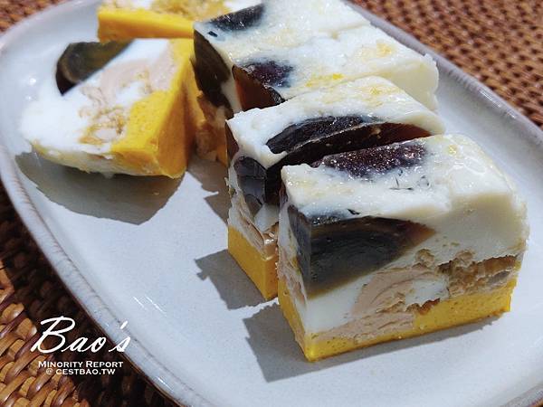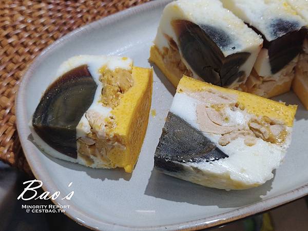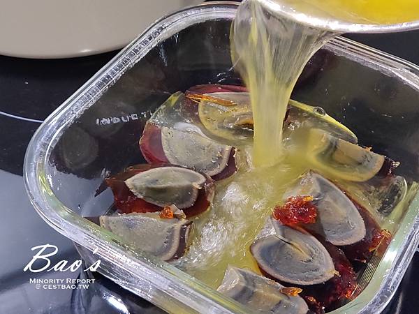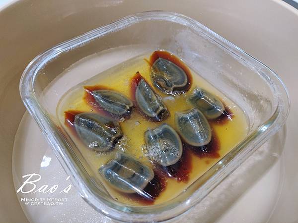 皮蛋煮熟後切塊,再放入抹油的容器裡。