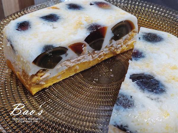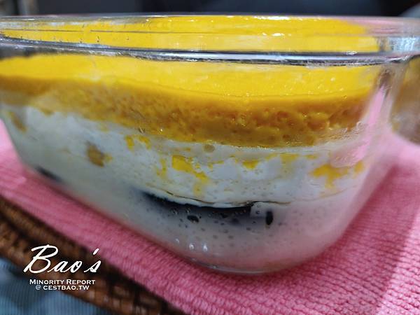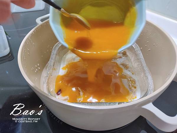 再次等到蛋白凝固,掀蓋、鋪上最後一層的蛋黃液,進入最後一蒸。