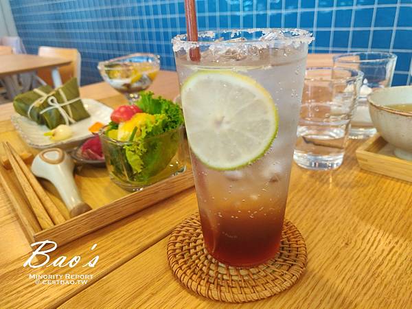 看了土土介紹跟著點的山林野草沙士,精髓是來自三玉號的野草糖漿,結合洛神花果露、馬告葉、大葉田香、月桃籽的清香,加入檸檬片後製成的特調飲品。