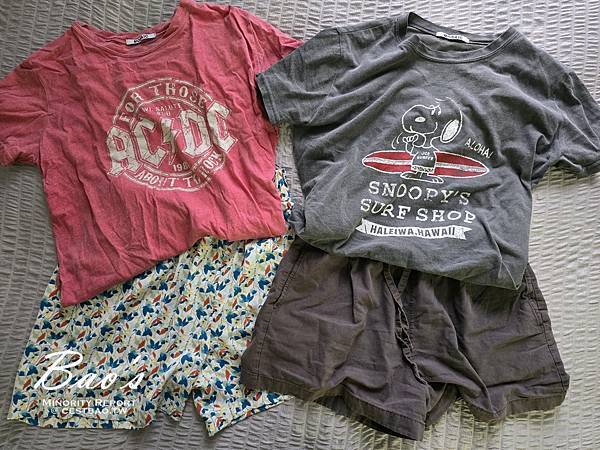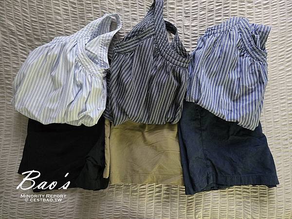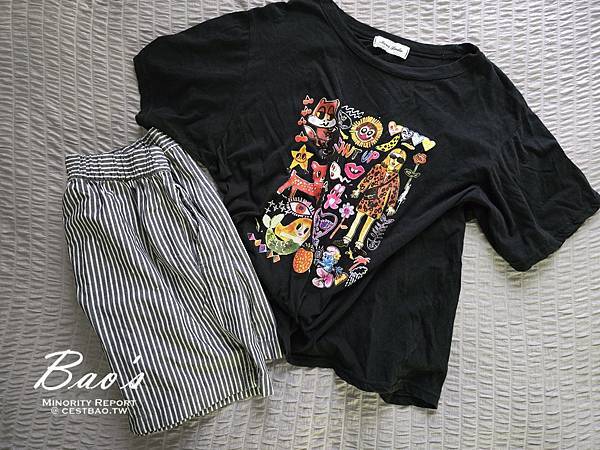 繽紛款來自Joli Paris的折扣商品,剩下最後一件M根本是註定要讓我帶走;灰褐色的棉麻短褲也是來自Uniqlo,但這款膚觸略粗一咪咪,特色是輕薄透氣、但洗完之後皺巴巴,平時穿還是稍嫌邋遢,選擇棉質輕便短褲才不用費心照顧。