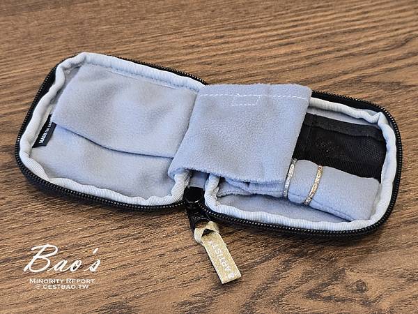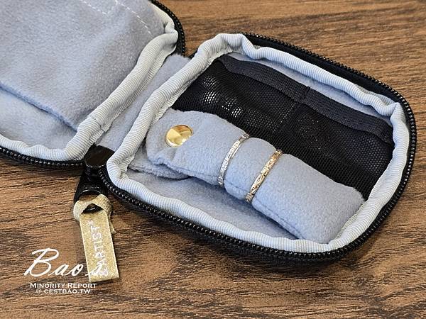 放戒指的柱狀填充物滿厚實的,套入國際戒圍11至13的戒指不困難,但若是手指纖細的女子... 嗯,若我要攜帶尾戒也會利用上方的網袋。